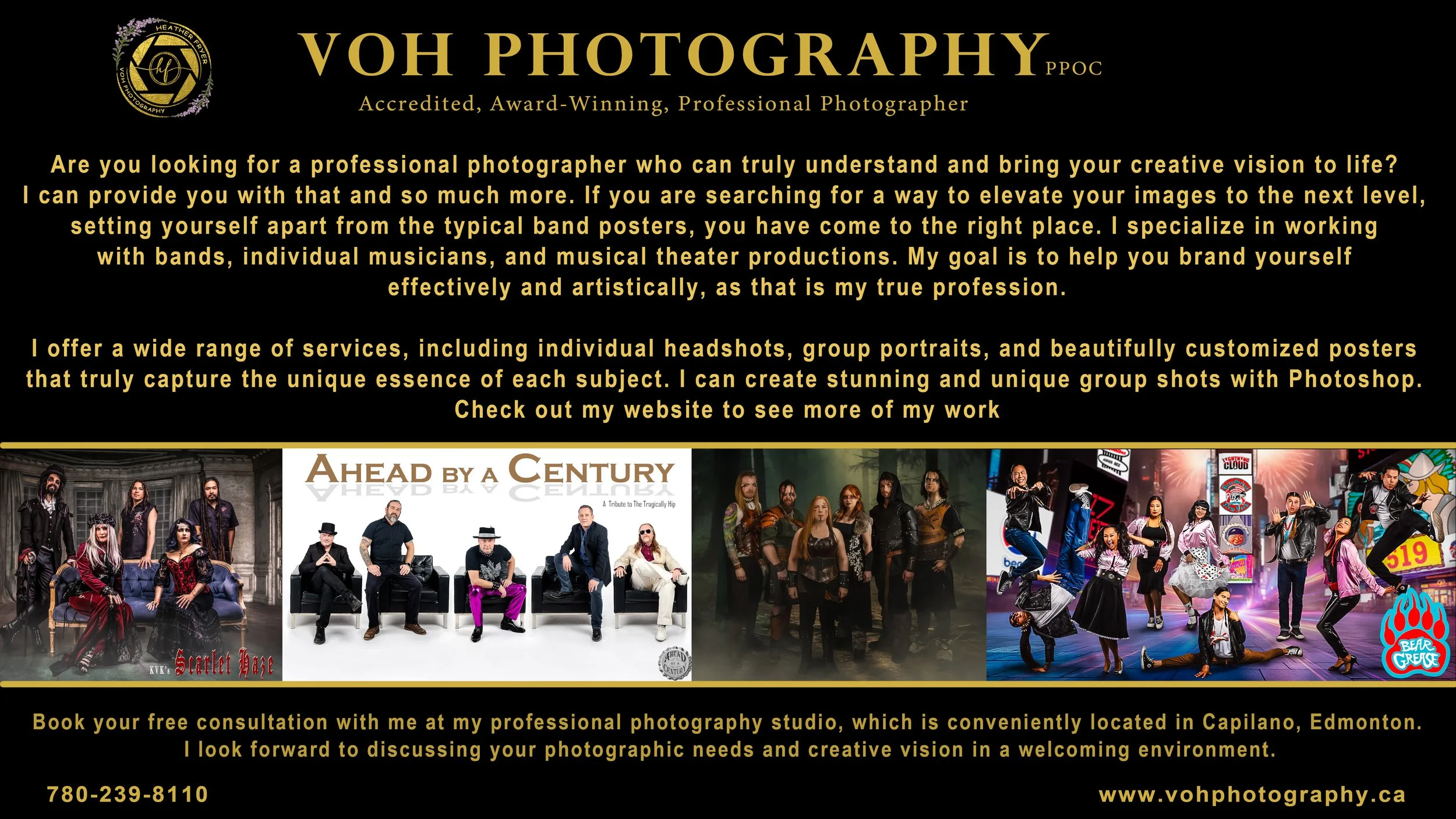 We will sit together and discuss your vision in detail for your band photos. I offer a very unique service that sets me apart from others in the industry. I've had bands with up to 10 members come in, and with my extensive experience in Photoshop, I have skillfully created composite images featuring all members in a single, cohesive photograph.